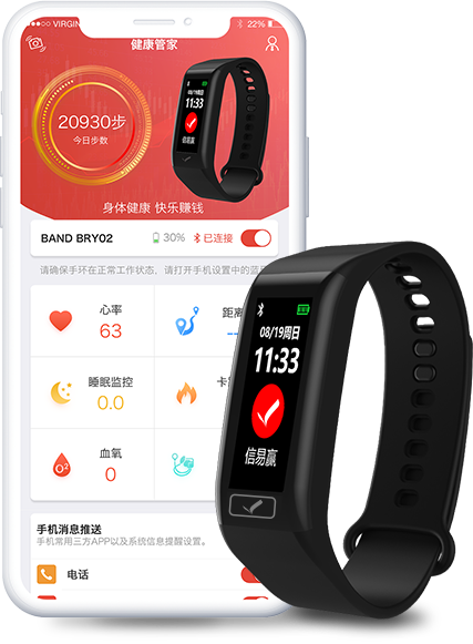 功能板块: 消息推送、步数、距离、卡路里、睡眠监测、心率监测、血压监测、血氧检测